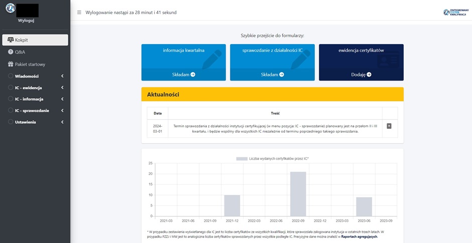 1. Informacje IC – ułatwia przekazywanie do podmiotu prowadzącego ZRK (IBE) tzw. informacji kwartalnych, w tym o liczbie certyfikatów wydanych w danym kwartale, standardowej wysokości opłat za walidację i certyfikowanie oraz liczbie osób, które nieodpłatnie przystąpiły do walidacji