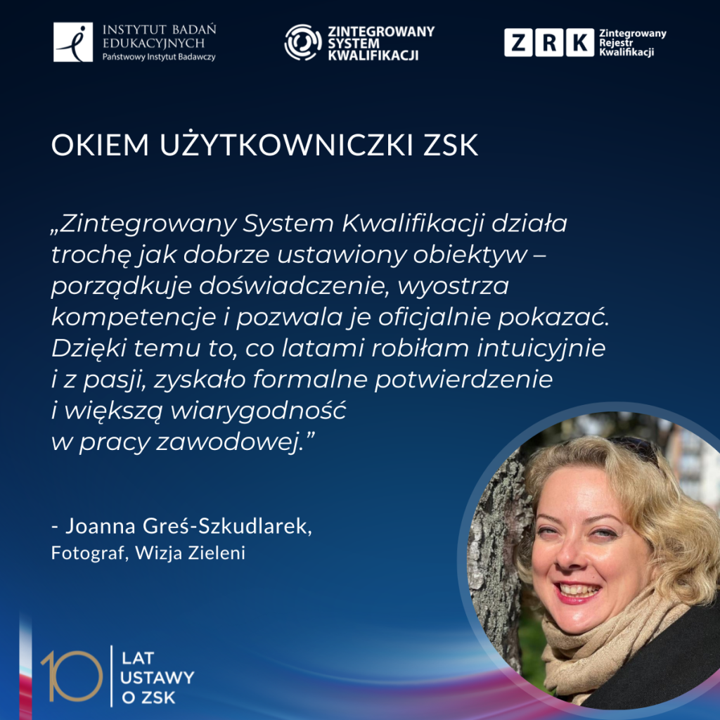 Po dekadzie działania systemu najmocniej wybrzmiewają właśnie indywidualne historie – ludzi, którzy postanowili uporządkować i oficjalnie potwierdzić to, co potrafią najlepiej. Jedną z nich jest Joanna – architektka krajobrazu i fotografka, która w 2025 roku uzyskała tytuł zawodowy fotografa dzięki ZSK. Jej droga pokazuje, jak system pozwala połączyć dwie pozornie różne pasje w spójną, wiarygodną i silną ofertę zawodową, budować lepszy wizerunek marki i z większą pewnością siebie pokazywać klientom efekty swojej pracy.