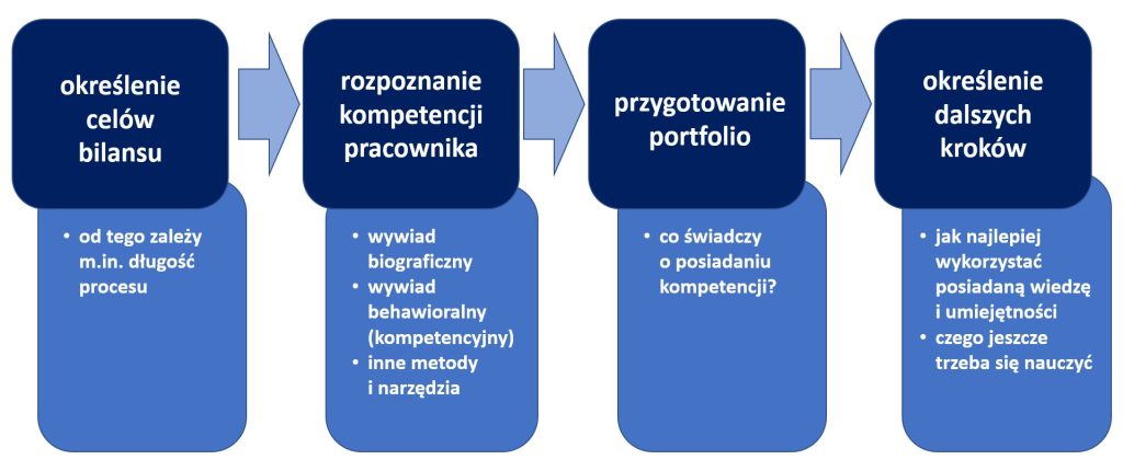 Osoba przechodząca bilans kompetencji z pomocą doradcy ustala wstępny cel związany z rozwojem edukacyjnym lub zawodowym. Następnie nazywa i porządkuje swoje kompetencje (czyli wiedzę, umiejętności i kompetencje społeczne) uzyskane w toku całego życia, w pracy i poza nią. W oparciu o tę wiedzę tworzy portfolio z dowodami na posiadanie kompetencji (np. próbkami pracy, zdjęciami, filmami, referencjami). Całość wieńczy plan rozwoju przygotowany na podstawie doprecyzowanego celu i rozpoznanych kompetencji.