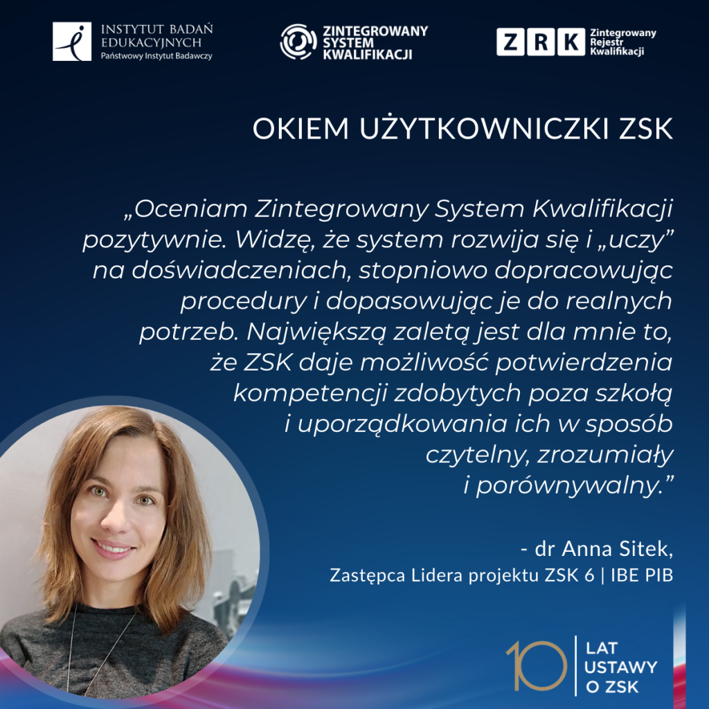 Oceniam Zintegrowany System Kwalifikacji pozytywnie. Widzę, że system rozwija się i „uczy” na doświadczeniach, stopniowo dopracowując procedury i dopasowując je do realnych potrzeb. Największą zaletą jest dla mnie to, że ZSK daje możliwość potwierdzenia kompetencji zdobytych poza szkołą i uporządkowania ich w sposób czytelny, zrozumiały i porównywalny.